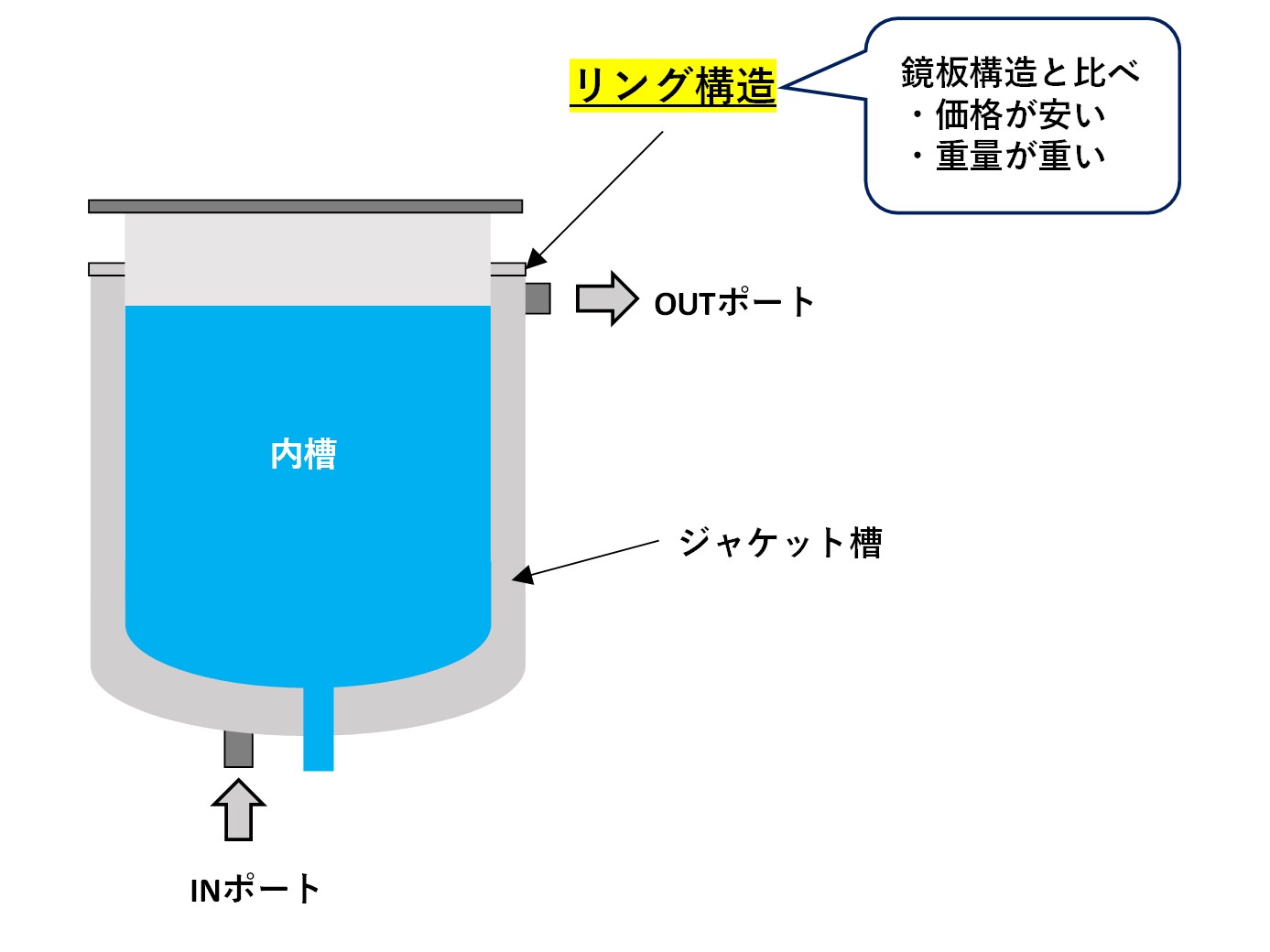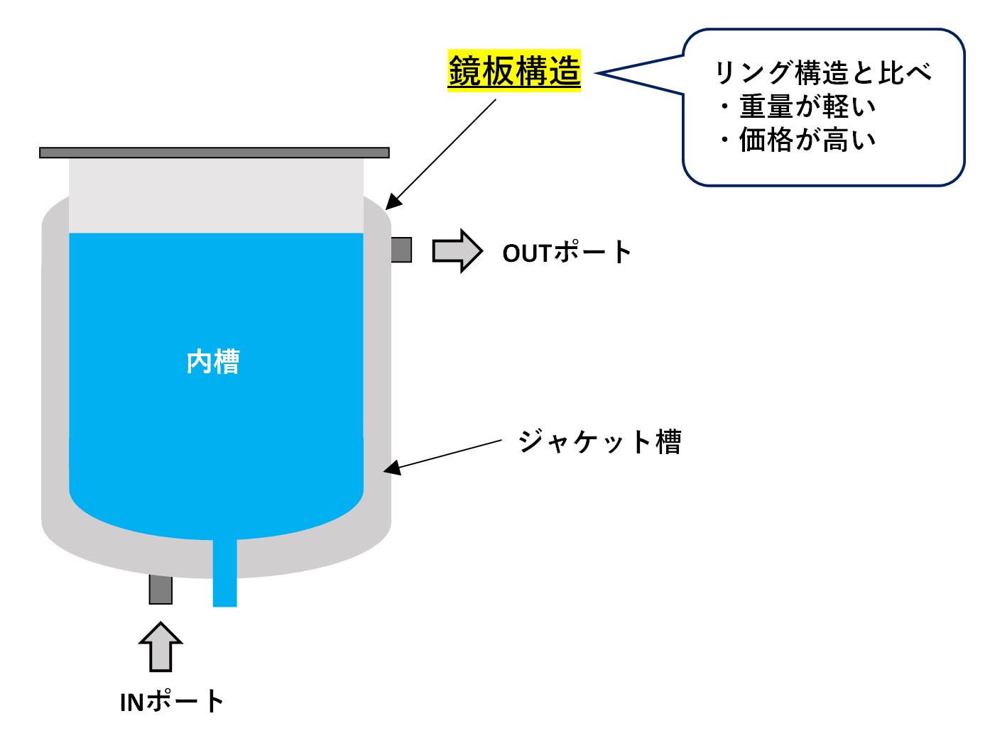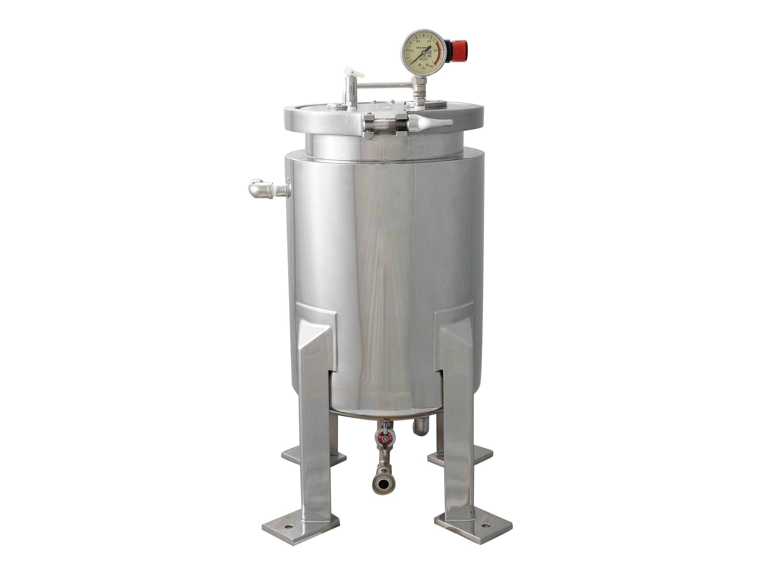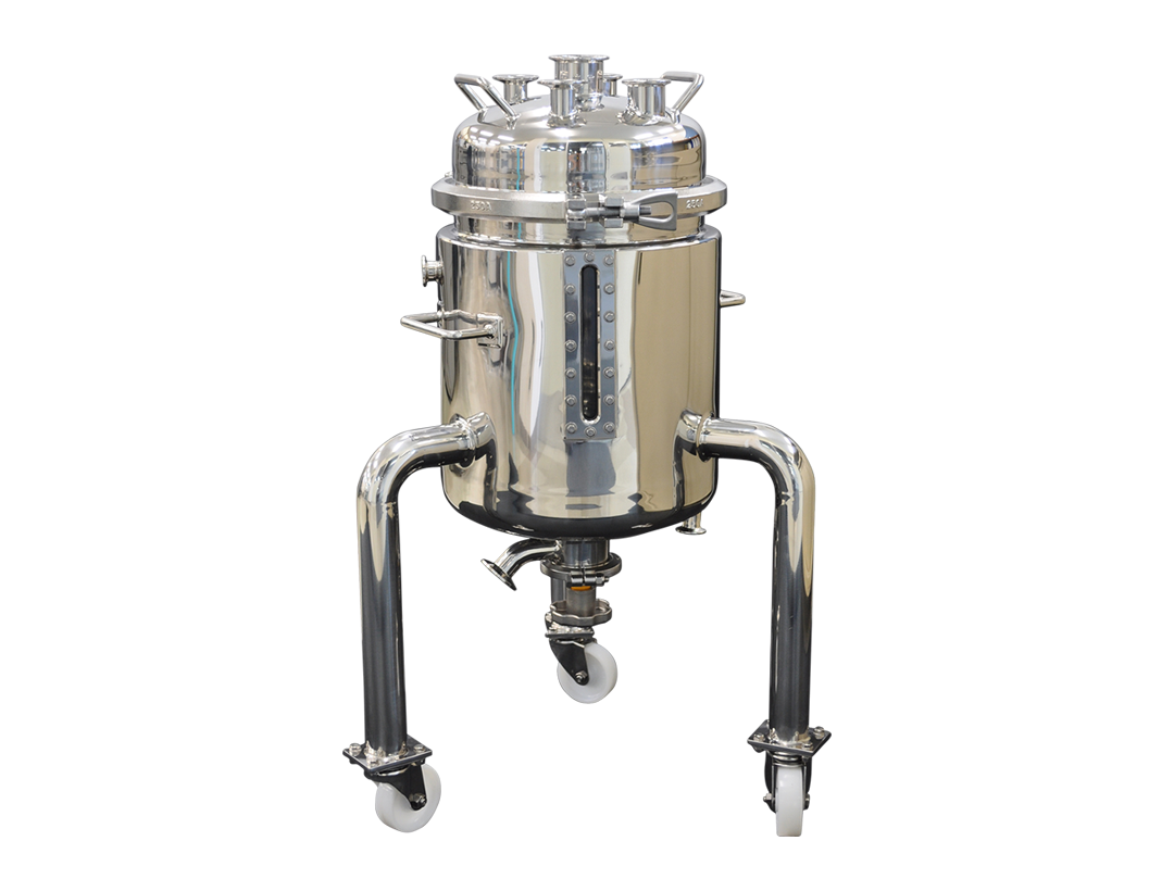 一般的な2重構造の加圧式ステンレスタンクです。 温度調節器と接続し、ジャケット槽内で温水や冷水を循環させることで加温・保温・冷却など、高精度な温度制御ができます。