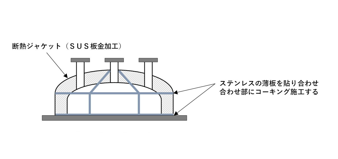 ステンレスの薄板を貼り合わせた断熱材でノズルが多く複雑な形状でも施工が可能です。 板の貼り合わせ部はコーキングを行い、液体の侵入を防ぎます。