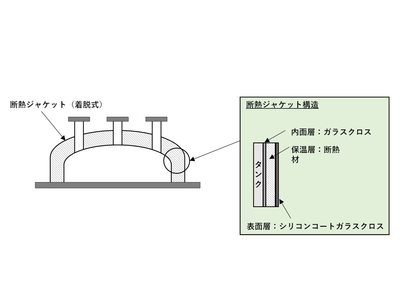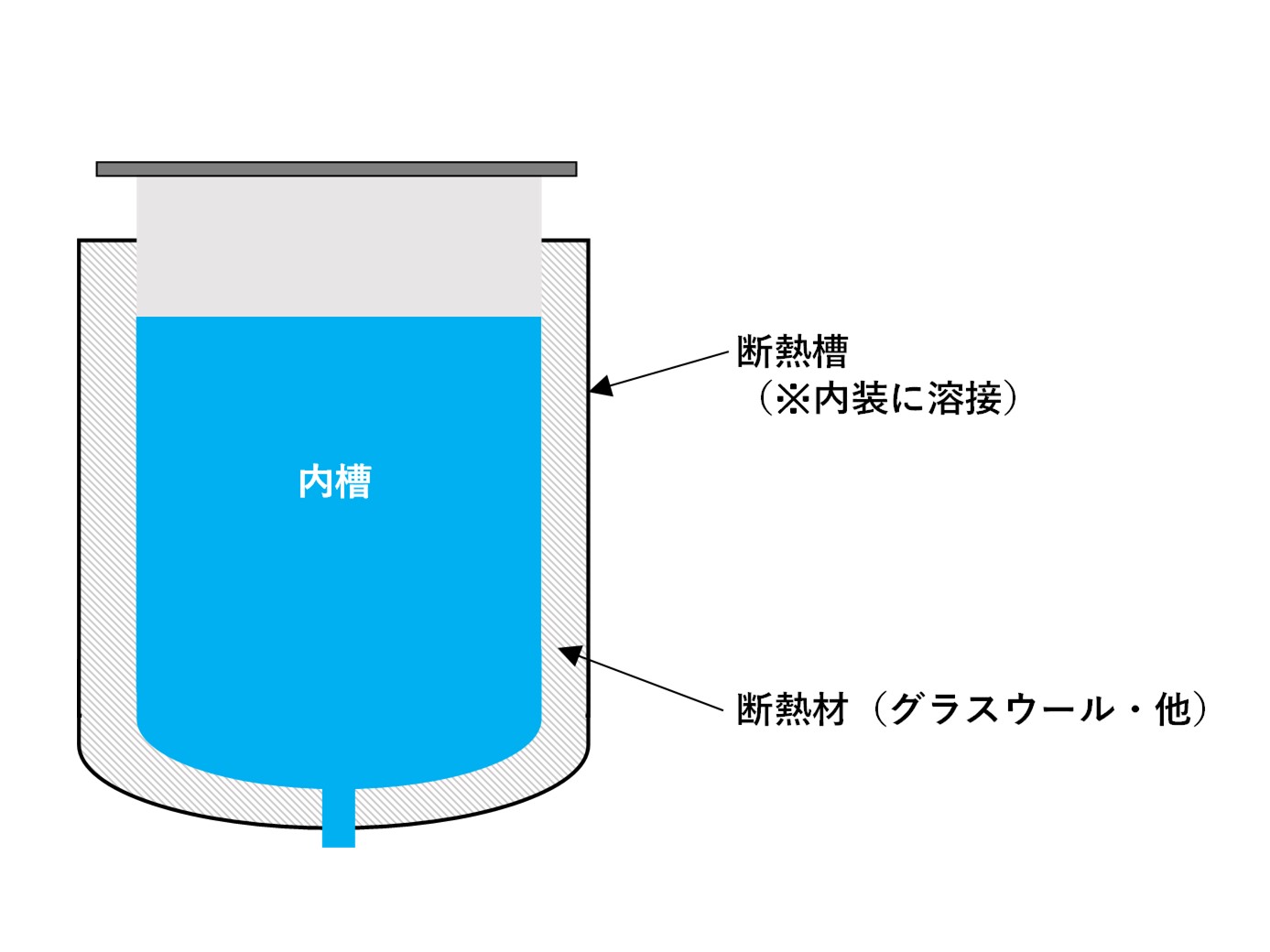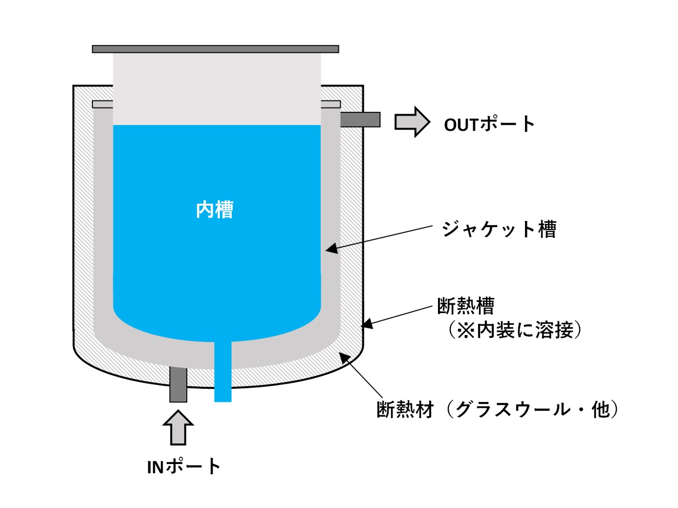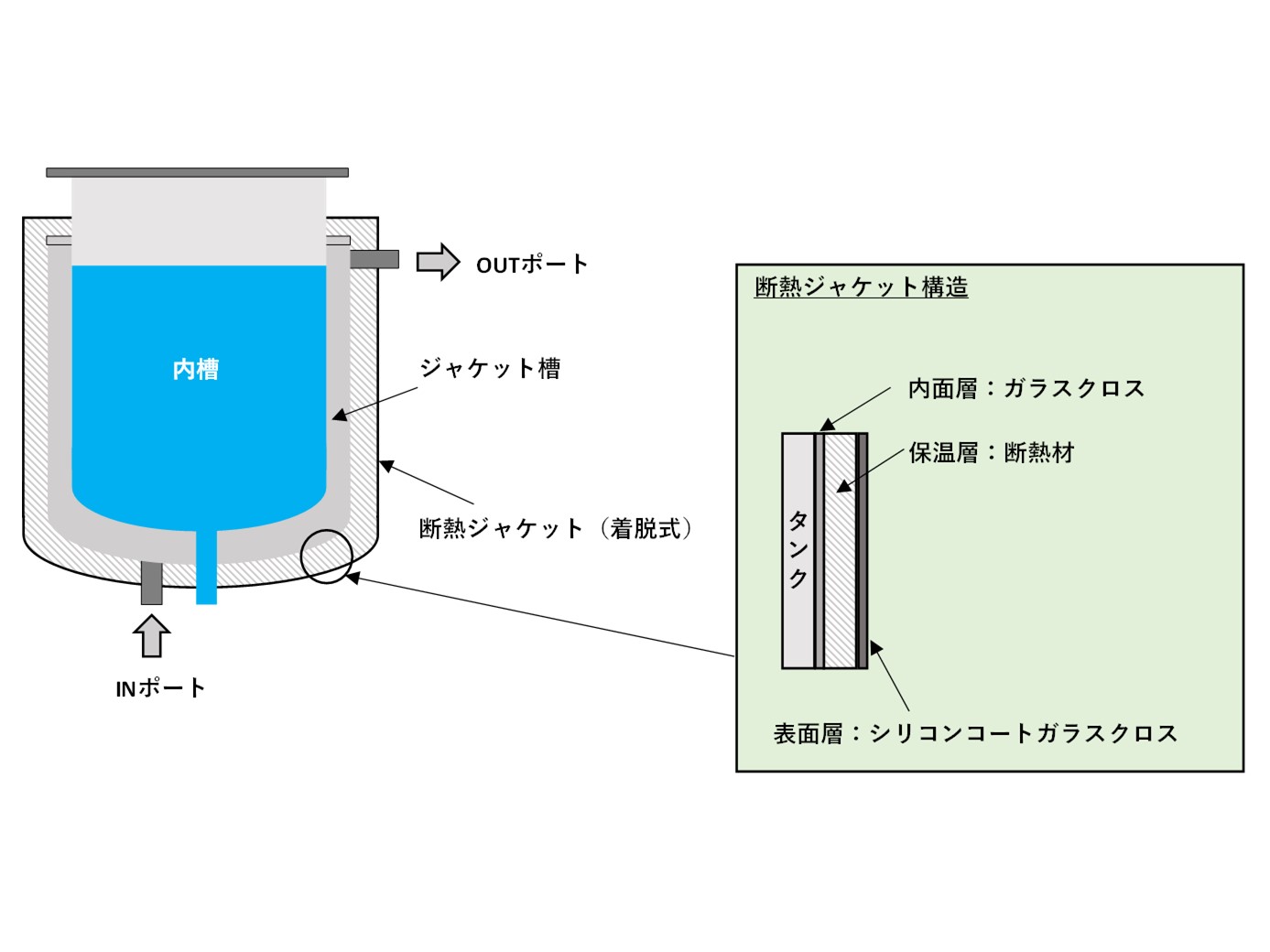 ステンレスタンクの外側に断熱槽を溶接する保温・保冷用の断熱ジャケットです。 溶接構造で液の侵入が無いため、断熱槽ごと丸洗いが可能です。