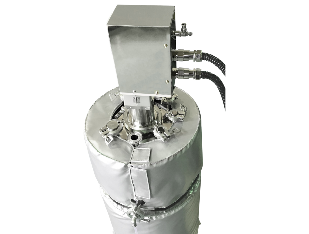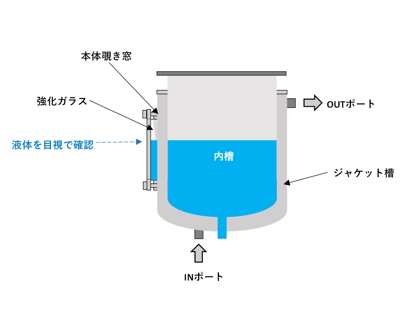 タンク本体に覗き窓の付いたジャケットタンクで、液体の量や状態を目視で確認できます。 窓は加圧・真空で使用可能な強化ガラスです。