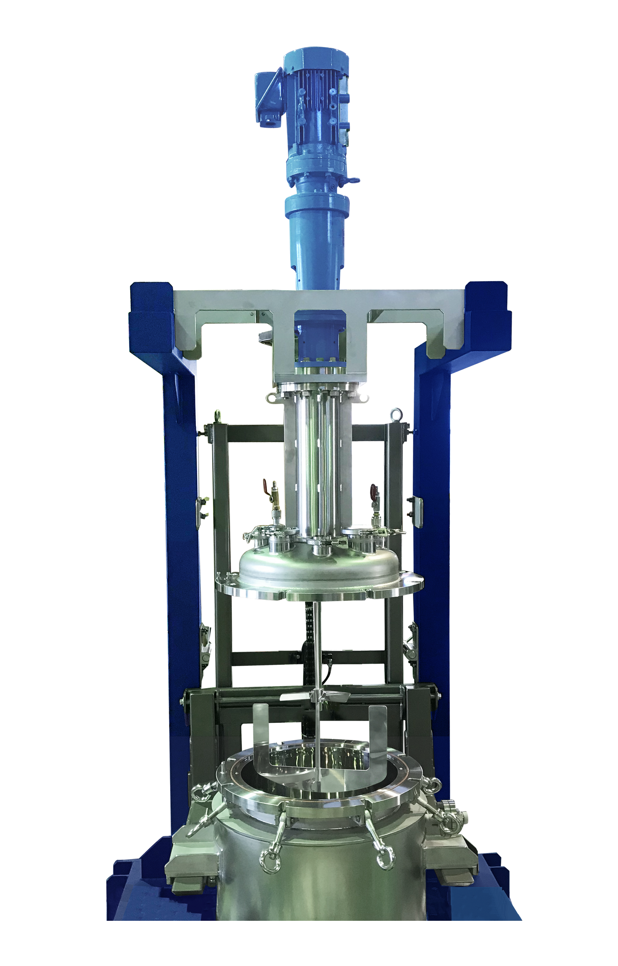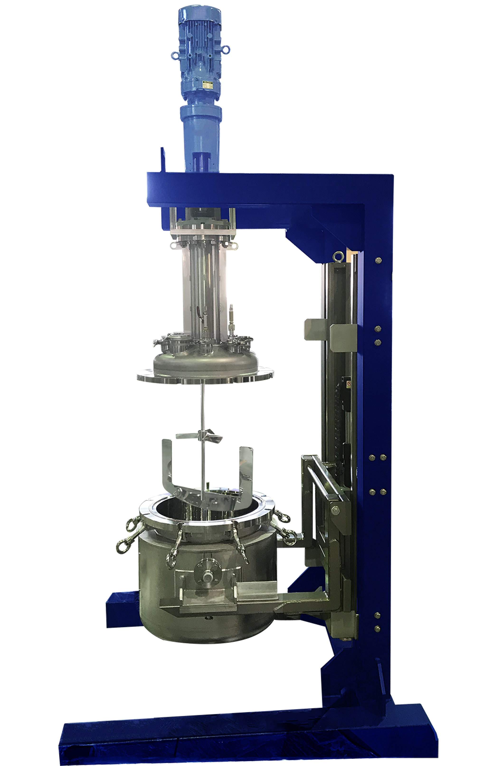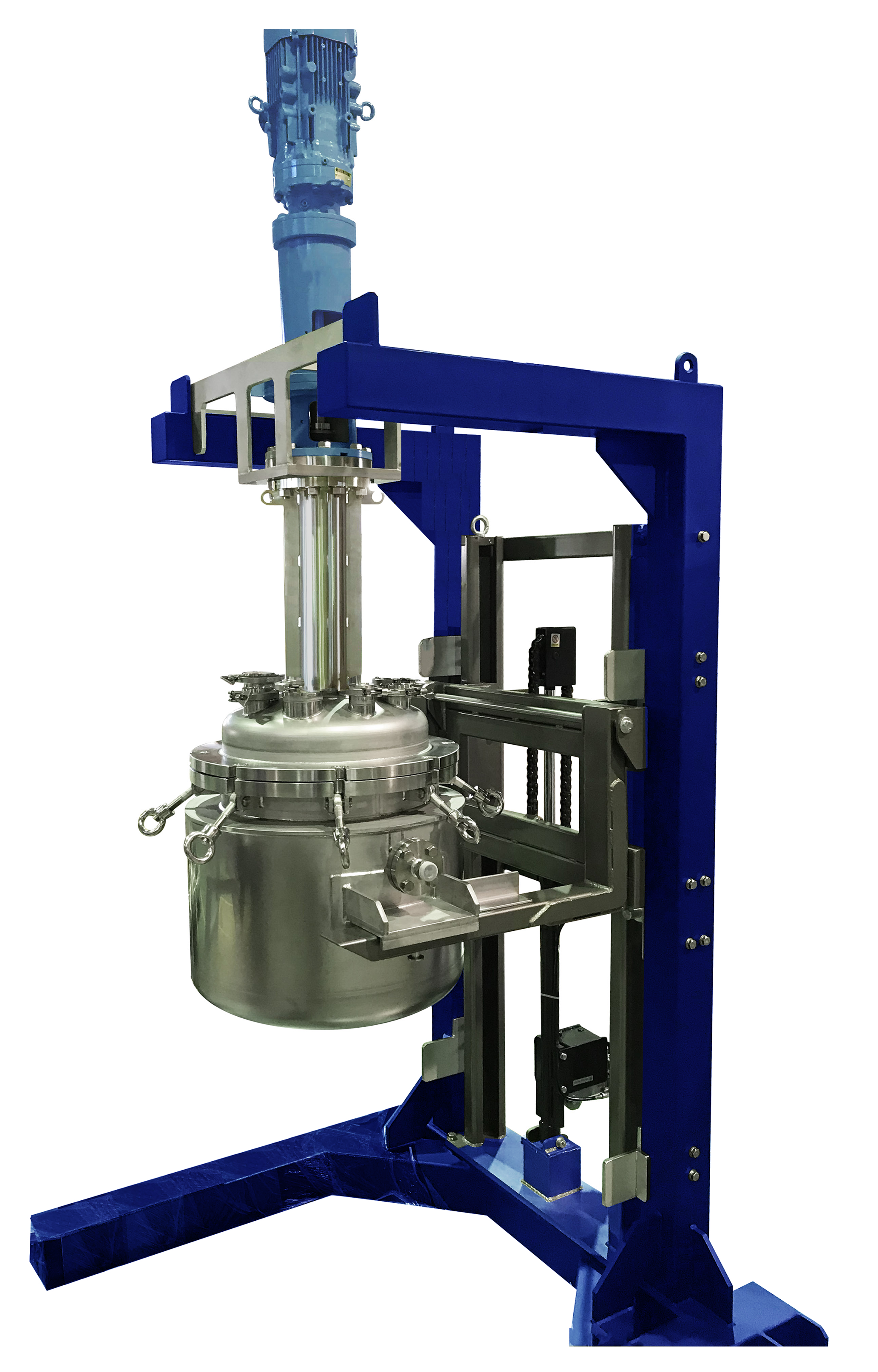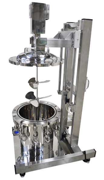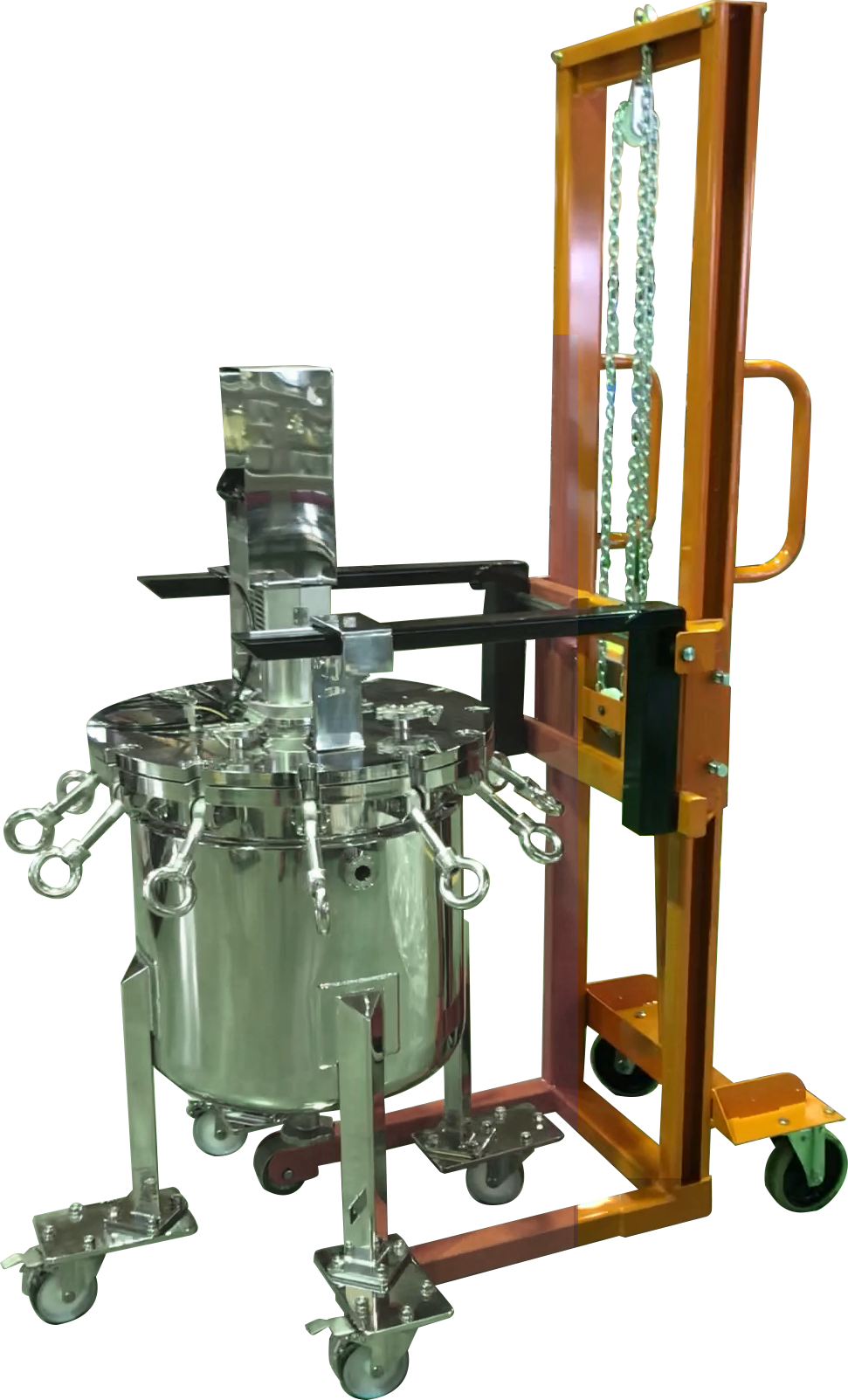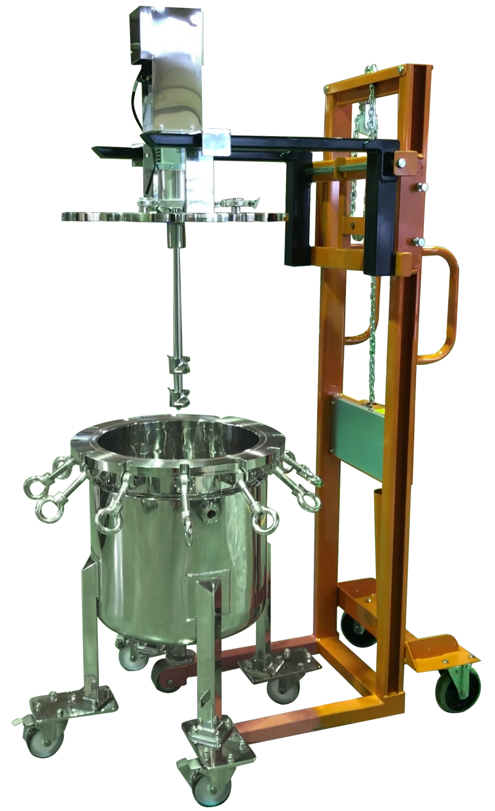 ステンレスタンクの蓋を安全に開閉することができる昇降ユニットです。大きな撹拌機を搭載した蓋は重量物となるため、取扱いに注意が必要です。