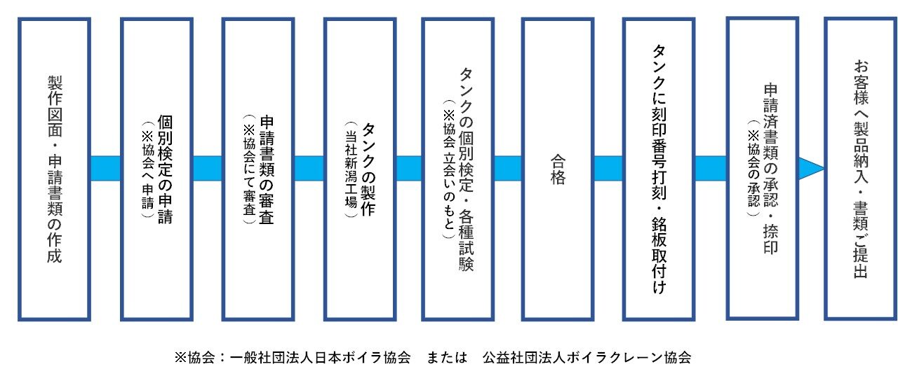 個別検定の申請には、以下の書類が必要となります。 当社で書類を作成し、協会へ申請します。 《申請書類》 ・個別検定申請書 ・第二種圧力容器明細書(仕様書) ・製作図面(構造や溶接の詳細を示す図面) ・強度計算書 ・材料証明書(耐圧部の材料とボルト類) ・内容積計算書 ・第二種圧力容器該当理由書 ・フローシート(必要に応じて)