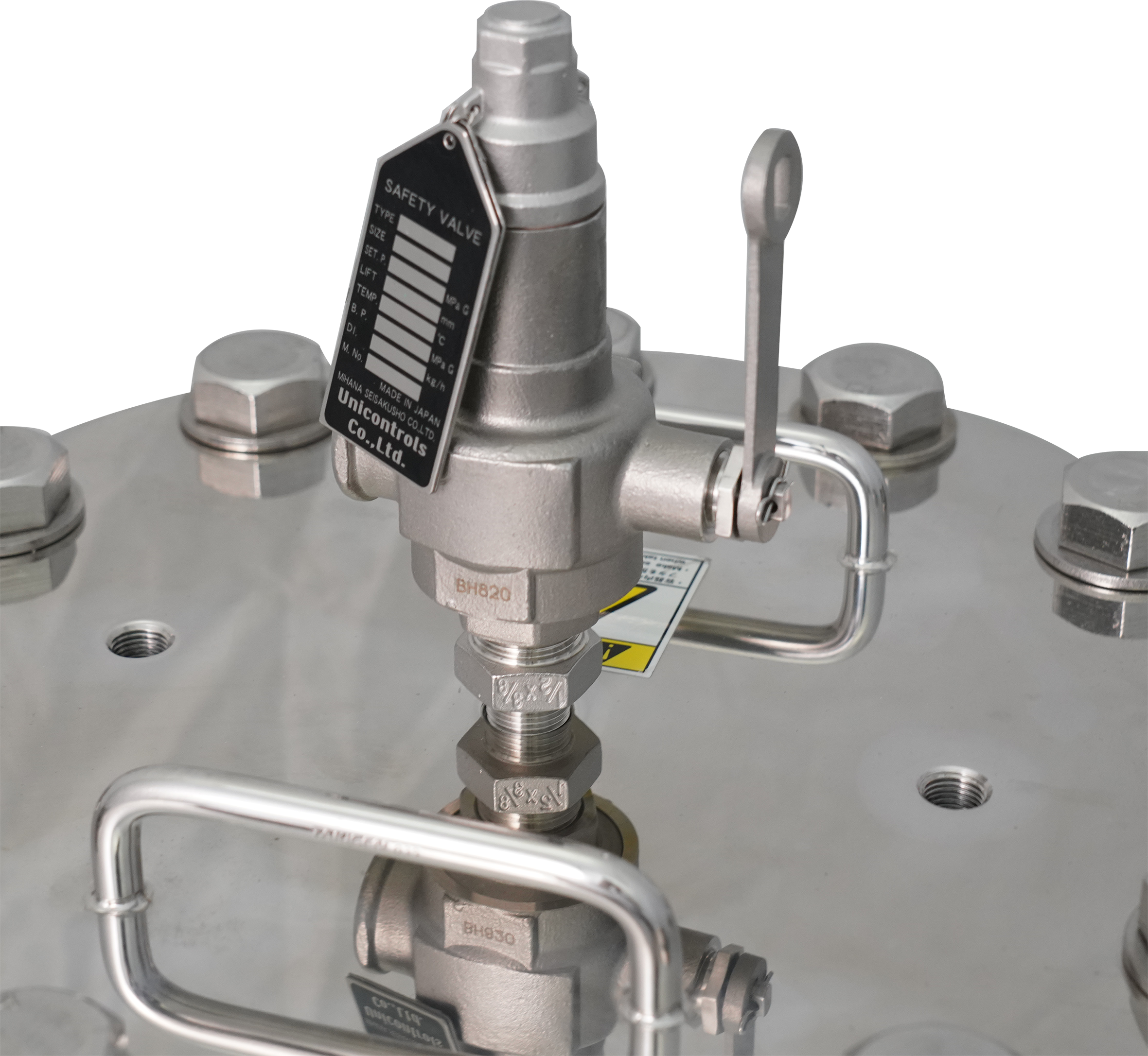第二種圧力容器には安全弁の取付けが義務付けられます。 ・安全弁の設定圧力 : タンクの最高使用圧力以下で作動(排気)する圧力に設定 ・タンクへの接続径 : 15A以上(Rc1/2以上) ※安全弁の『検査合格書』『安全弁吹出量計算書』を添付して個別検定を行います。