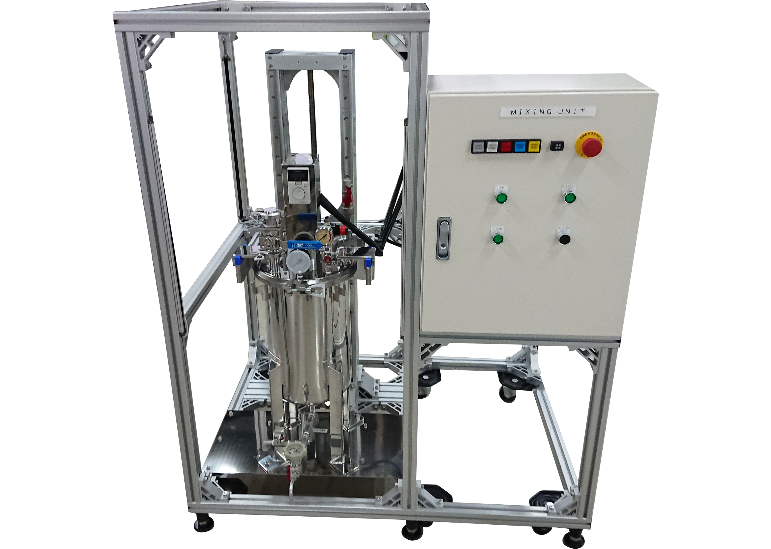 液体の調合・ろ過・撹拌・真空脱泡・温度調節・計量・供給を自動で行う制御ユニットです。移動式の小型ユニットのため、小ロット生産や研究開発用の設備としても有効です。
