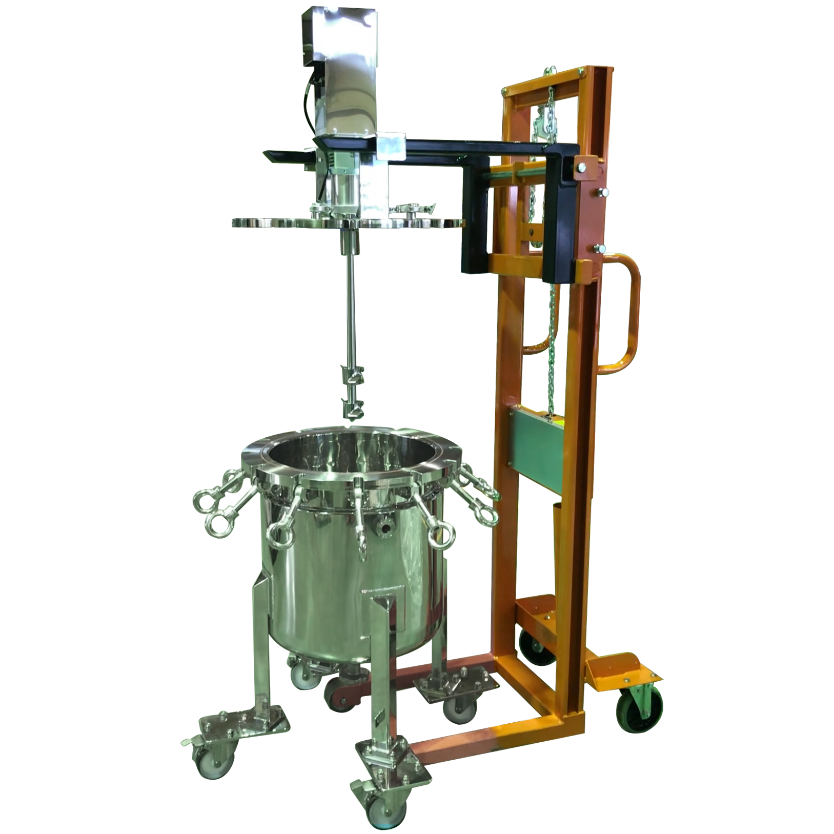 ステンレスタンクの蓋を安全に開閉することができる昇降ユニットです。大きな撹拌機を搭載した蓋は重量物となるため、取扱いに注意が必要です。
